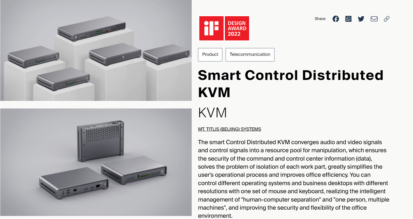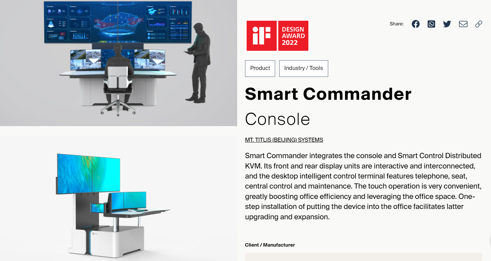 源自對原創(chuàng)設(shè)計的堅持,對產(chǎn)品質(zhì)量的精益求精,在2020年和2021年的新品發(fā)布中,鐵力山研發(fā)設(shè)計的 “智慧指揮官”產(chǎn)品化解決方案以及全架構(gòu)Smart control智控協(xié)作系統(tǒng)斬獲具有工業(yè)設(shè)計界“奧斯卡”的德國iF設(shè)計大獎。