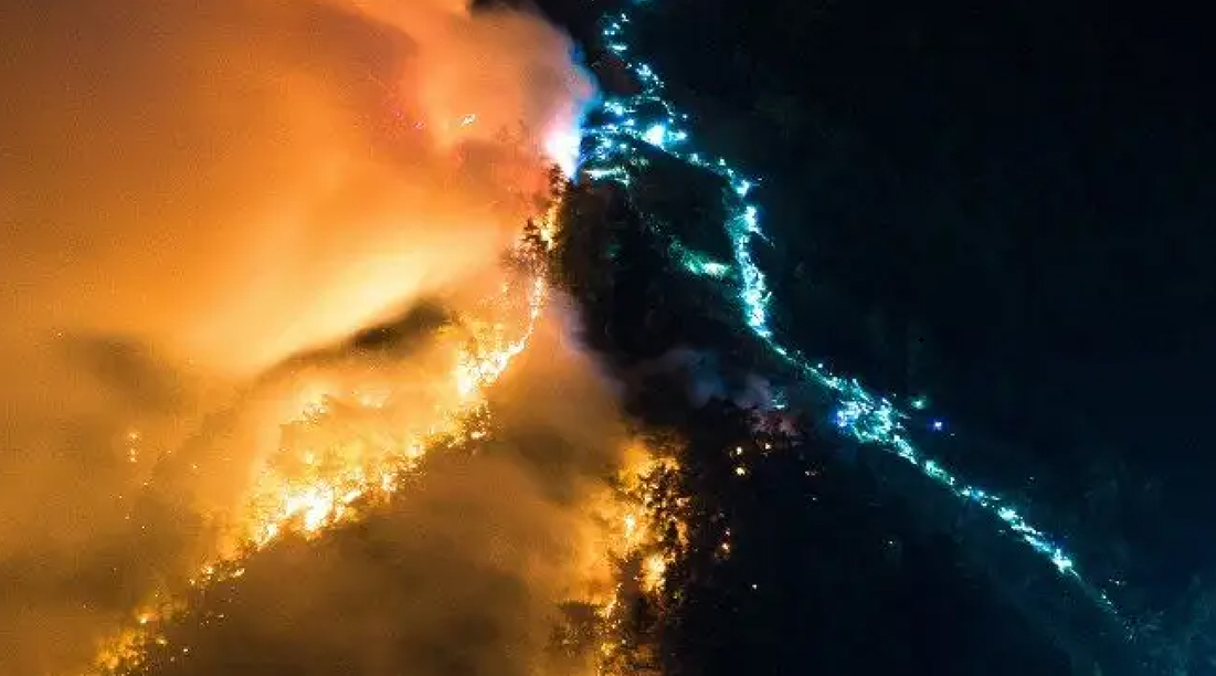 重慶北碚縉云山山火決戰(zhàn)線上,紅色是肆虐的山火,藍色的是抗擊山火人群的頭燈